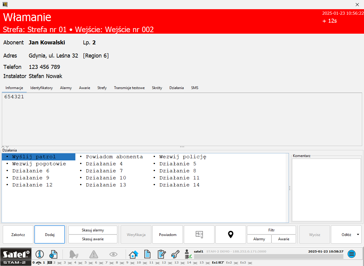 - Po otrzymaniu zdarzenia alarmowego, awarii lub błędnego stanu czuwania przystąp do jego obsługi (screen 4), wykonaj kolejne działania, które wcześniej wyedytował administrator systemu.