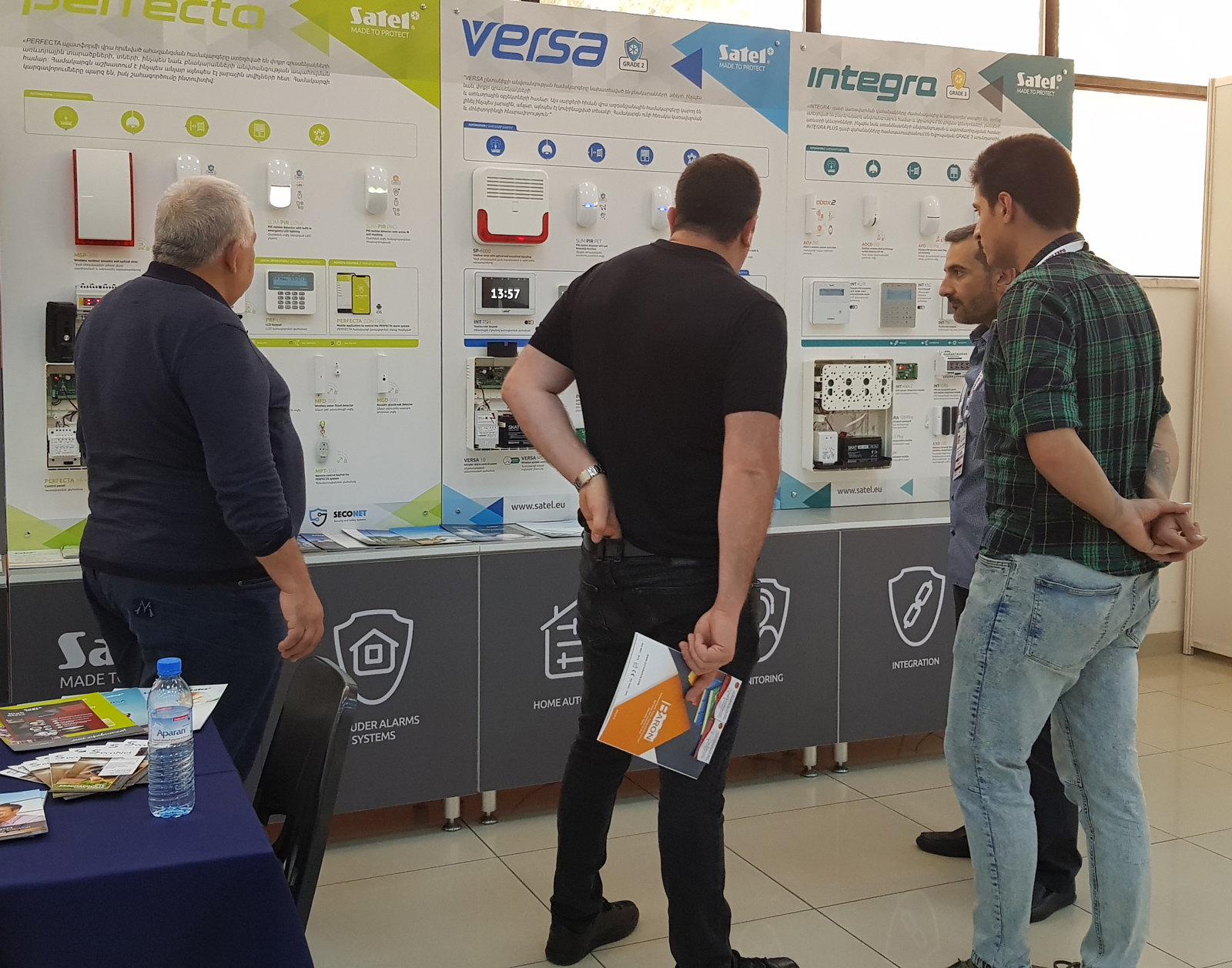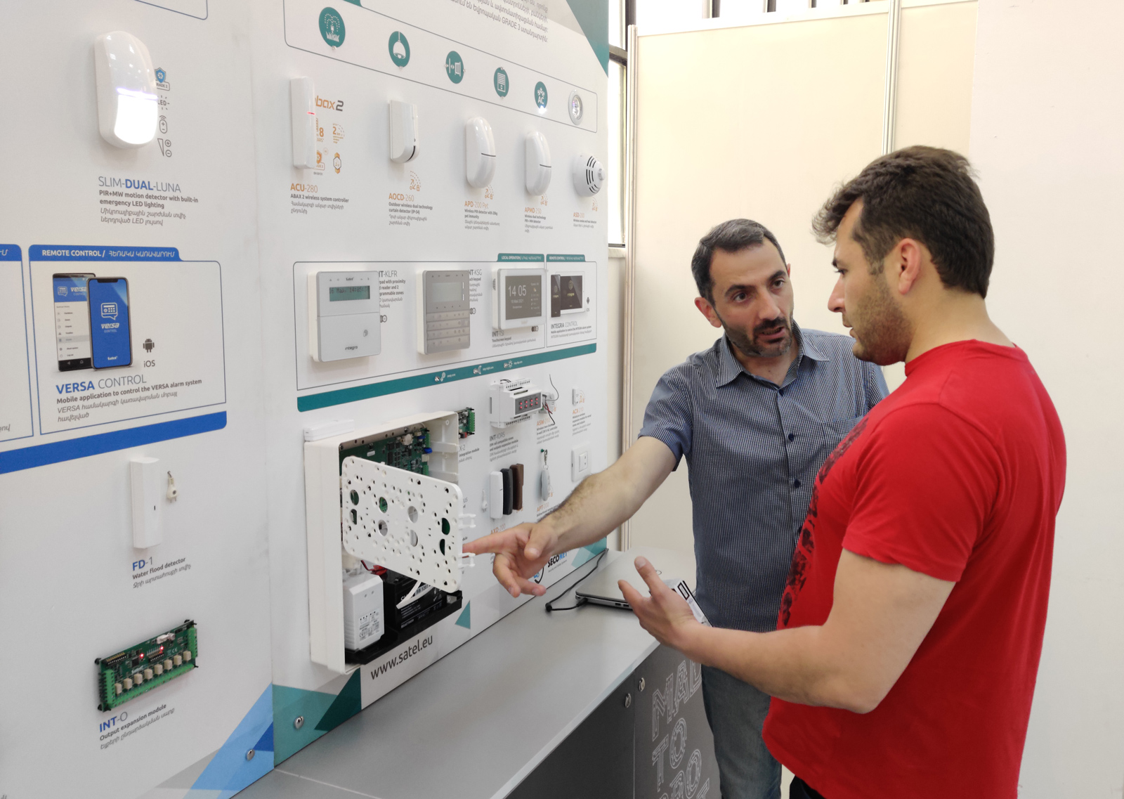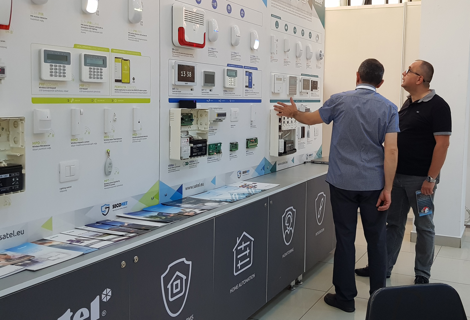 Goście mogli z bliska przyjrzeć się urządzeniom SATEL, pracującym w ramach systemów alarmowych PERFECTA, VERSA oraz INTEGRA, a także produktom z rodziny urządzeń bezprzewodowych ABAX 2. Na ściance wystawienniczej znalazły się też m.in. czujki ruchu z rodziny SLIM LINE, manipulatory dotykowe INT-TSI, INT-TSH i INT-TSG oraz tradycyjne manipulatory PRF-LCD, moduły komunikacyjne czy piloty do zdalnego sterowania systemem.